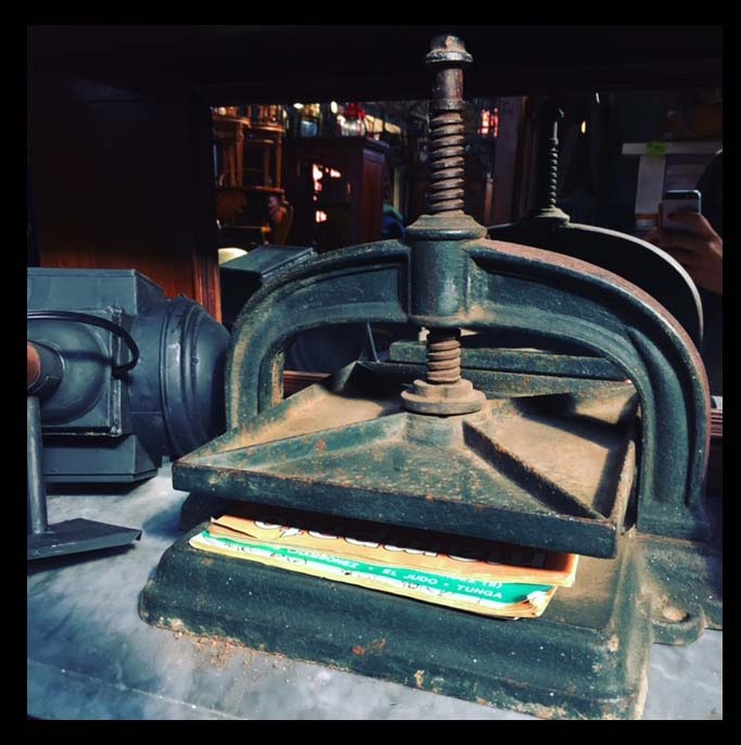 Esta es una prensa de libros de fierro, que se usaba originalmente en los procesos de encuadernación.Hoy la tecnología ha llevado a que varios de estos objetos queden obsoletos en cuanto a su uso tradicional, pero pueden ser empleados con otros fines decorativos o funcionales.