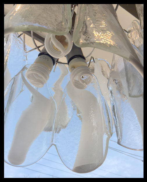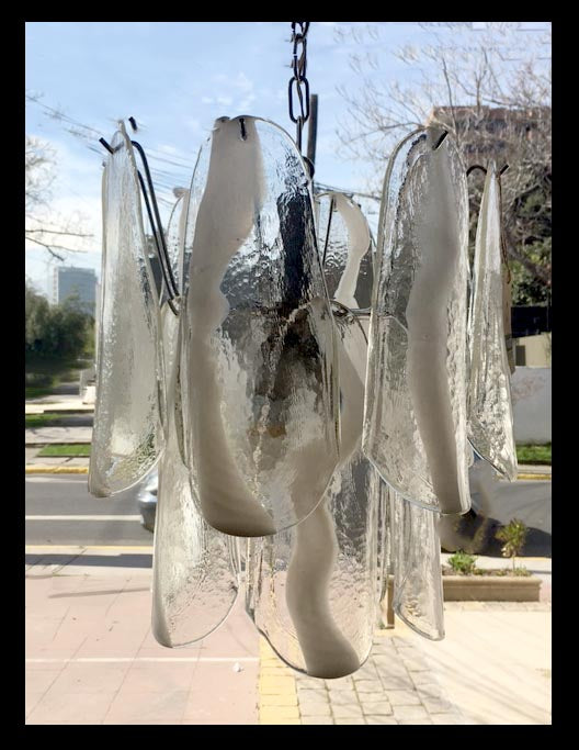 Desde la invención del fuego hasta nuestros días, el hombre ha buscado creativas formas de iluminar los espacios que habita. Al comienzo, eran las antorchas, luego los candiles seguidos de diversas formas de luminarias a petróleo que se activaban con fuego. Con la invención de la luz eléctrica los diseños y posibilidades de las lámparas aumentaron exponencialmente. Cada país y estilo imperante fue creando diversas formas de alumbrar.Esta es una gran lámpara de araña colgante italiana Mazzega de 3 luces.Está armada con pétalos de cristal de Murano con manchas blancas – vidrio claro helado. La estructura de la cadena es de cromado original.