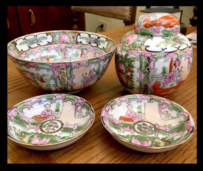 Este tipo de diseño de porcelana fue fabricada en Macao, China, antigua colonia portuguesa.Durante más de 4 siglos, Portugal abasteció a Europa de este tipo de porcelana. Recién en 1999, Macao comenzó a formar parte de la República Popular China. La porcelana de Macao destaca por su fineza y delicadeza. Cada pieza está pintada a mano.Este es un juego Macau pintado a mano de los años 30’-40′.