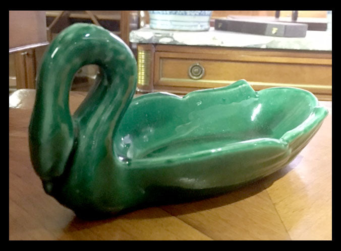 Esta es una cerámica de cisne verde de Vallauris, ciudad de Francia. Esta ciudad es conocida por la artesanía artística, y más concretamente por la alfarería y la cerámica. En el siglo XX, Picasso, con su producción cerámica, impulsó el desarrollo de la artesanía artística de la ciudad.Puede tener diferentes usos: desde una elegante forma de servir mantequilla o mermelada hasta una jabonera o simplemente un elemento decorativo.