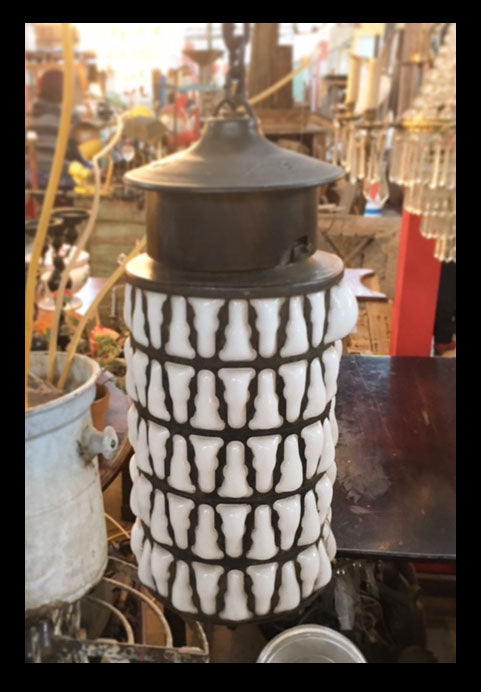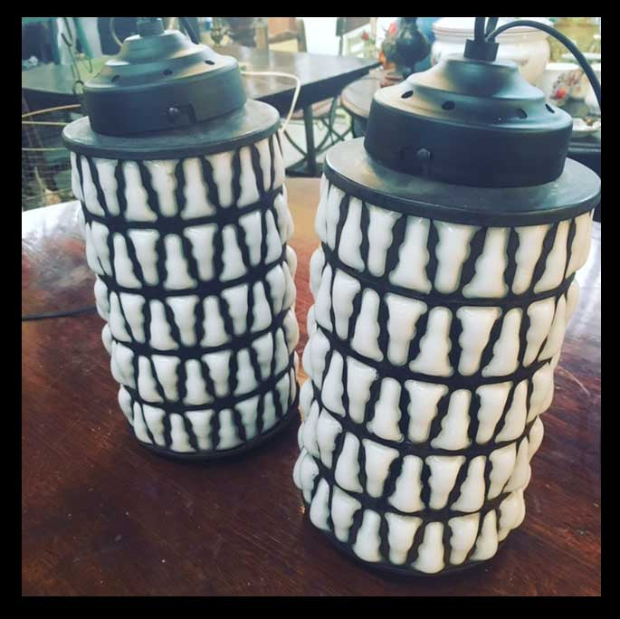 Desde la invención del fuego hasta nuestros días, el hombre ha buscado creativas formas de iluminar los espacios que habita. Al comienzo, eran las antorchas, luego los candiles y luego diversas formas de luminarias a petróleo que se activaban con fuego. Con la invención de la luz eléctrica los diseños y posibilidades de las lámparas aumentaron exponencialmente. Cada país y estilo imperante fue creando diversas formas de alumbrar.Estas son un par de lámparas colgantes de fierro y opalina. Miden 15 cm de diámetro y 30 cm de alto aproximadamente.